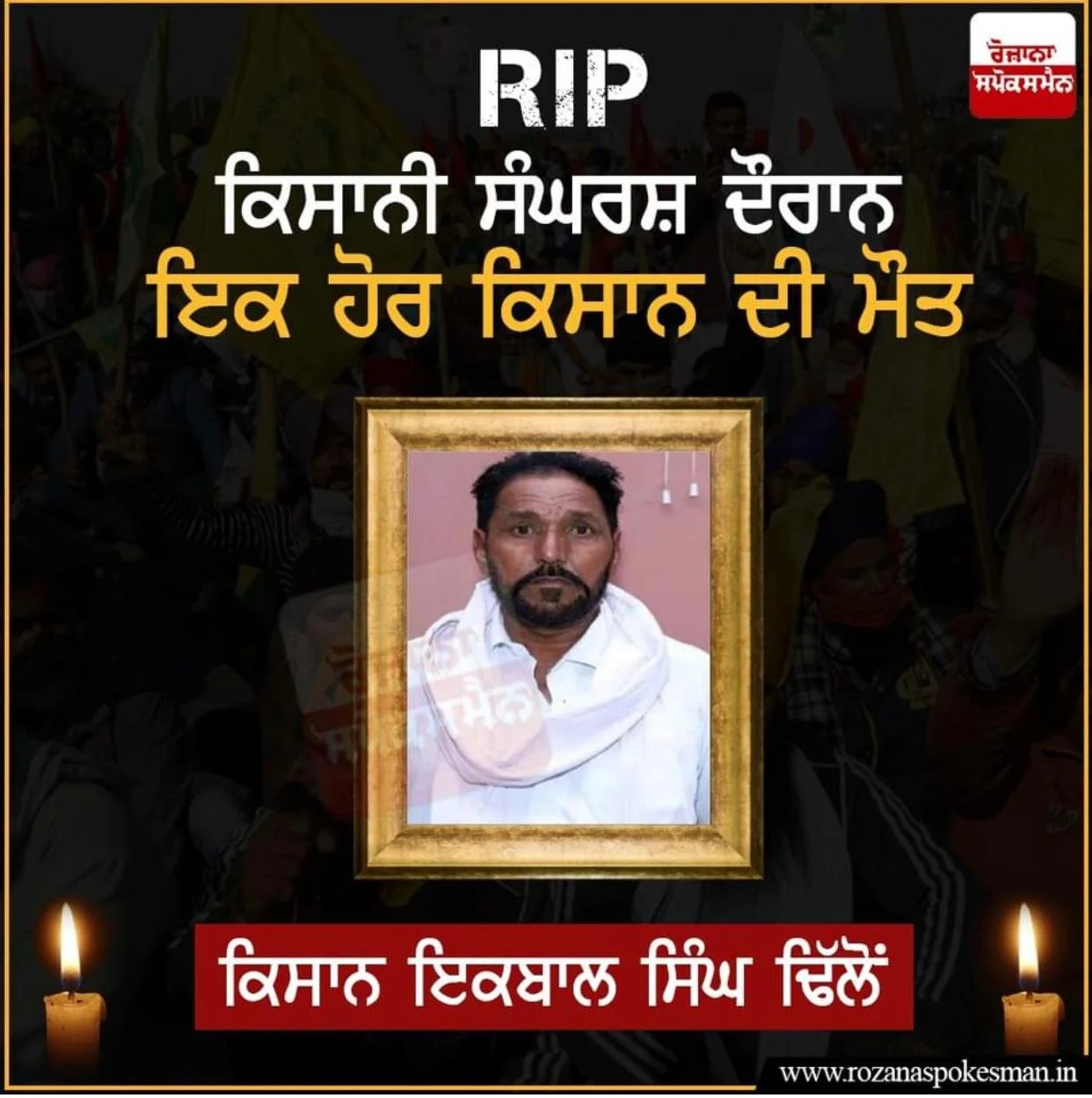 1. Farmer Iqbal Singh Dhillon (48) of village Gander, Mukatsar Sahib has passed away due to heart attack after returning from Tikri Border. He was sent home on Monday due to poor health. We are losing one man every 14hrs compared to earlier 16.5hrs. This is 78th death according to Amaanbali.