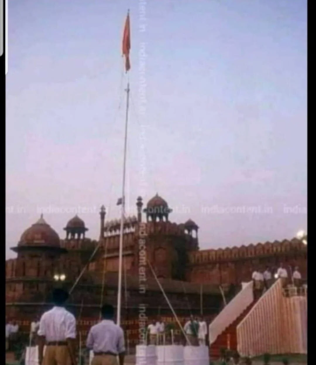 32. Old picture below is RSS hoisting their flag at Red Fort. So is this not going to cause a national crisis for Godhi media?