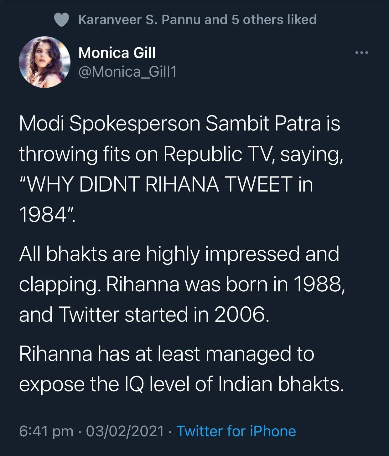 25. Celebrity BJP Twitter terrorist, Kanguna who’s devoted to Modi, tweets more hate to Rihanna and dubiously links her to Canadian NDP leader Jagmeet Singh.